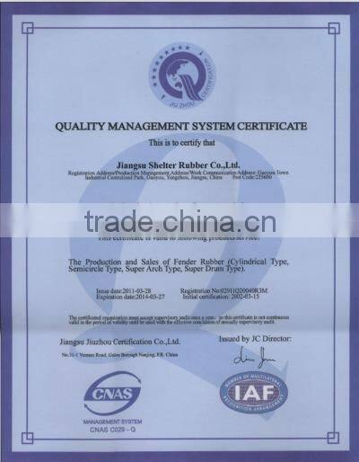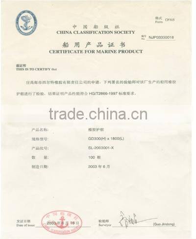 In 2002, we passed ISO9001:2000 International quality system certification, and we obtained many approvals, like the Authentication of CCS, Authentication of ABS, Trustworthy quality, The Model of honest Unit and the certificate of the advanced technology. In addition, we have passed ISO9001:2008 quality system certification. The rubber fenders of our company have better technology structure, excellent technical performance, and are abrasion-resistance and corrosion-resistance. We provide standard, low reaction, high reaction, and e super high reaction rubber fenders. We have been developing and producing a series of Rubber Fenders, including super cell fenders, cone fenders, super arch fenders, cylindrical and semi-cylindrical fenders, type GD, type I, type TT and type U fenders, turn cell fenders, rubber ladders, etc. Above all, we have created a new type rubber fender called color rubber fender, and this product is a big innovation in the rubber fender history.